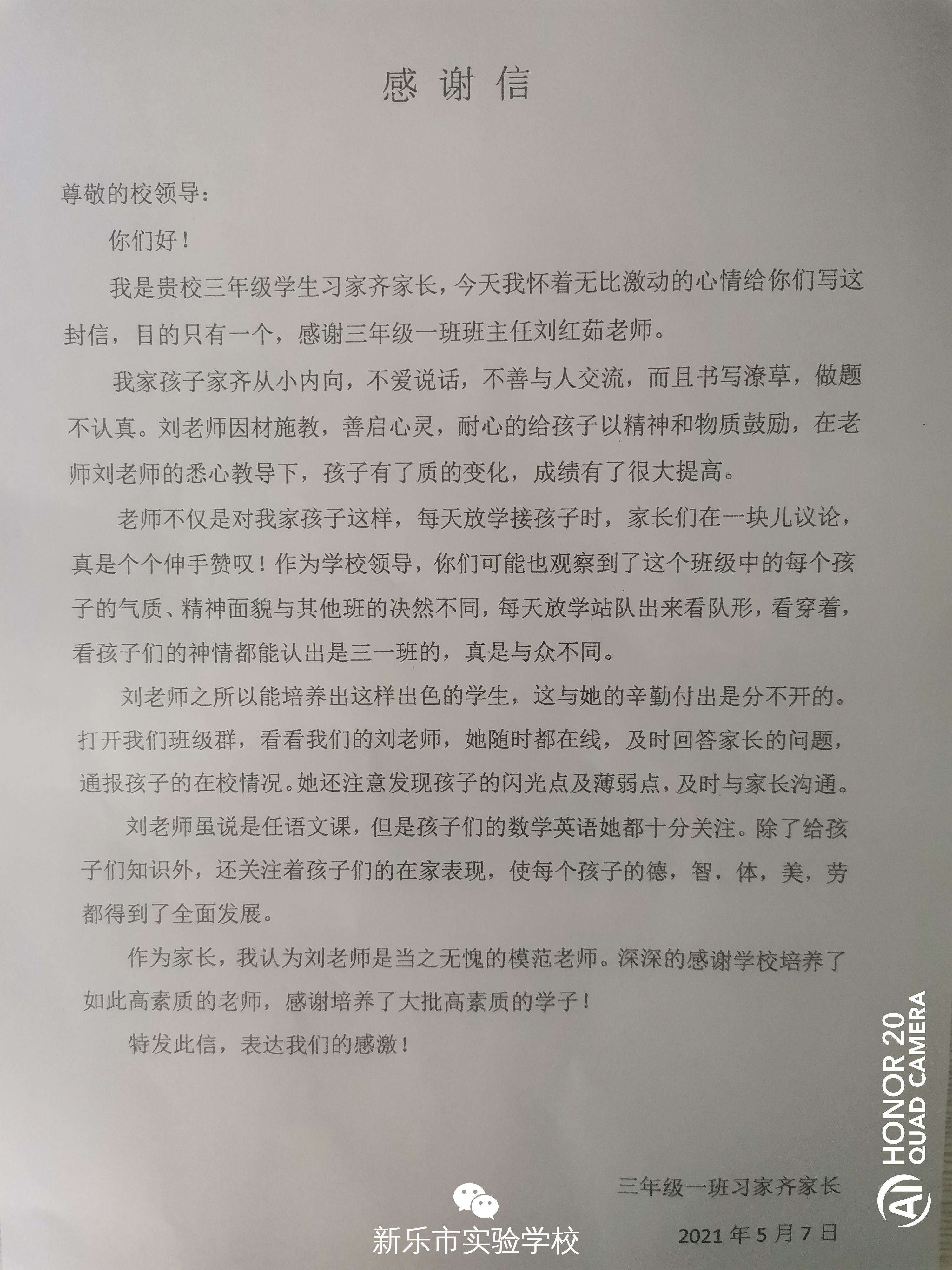 “落红不是无情物,化作春泥更护花。”老师对工作认真负责和对孩子的爱,深深打动了家长。家长表示,孩子们能遇到这样的老师是非常幸福和幸运的,以后,将会更加努力的支持老师和班级工作。作为习家齐同学的班主任,刘红茹老师不仅教给学生学科知识,而且走进学生内心,关注学生成长,注重学生的全面发展,积极与家长沟通,形成了家校共育的和谐氛围。